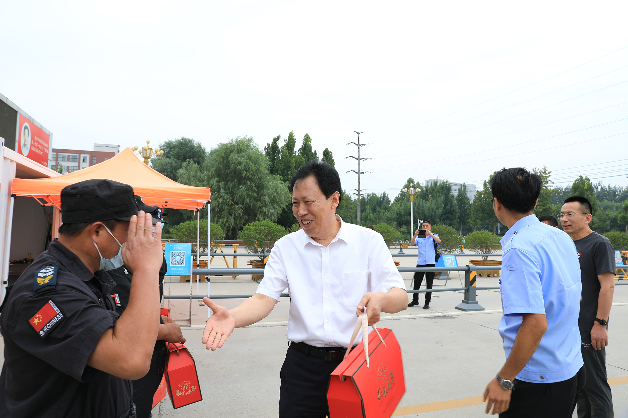 刘德云来到学院西门,和保安人员一一握手,将一份份带着温情的月饼递到每个人的手中。刘德云感谢大家一直以来的辛苦付出,感谢他们为平安校园建设作出的贡献,尤其是在中秋节期间依然“舍小家为大家”,坚守在校园防护第一线。刘德云代表学院万余名师生感谢大家的付出,并祝愿大家身体健康,阖家幸福。