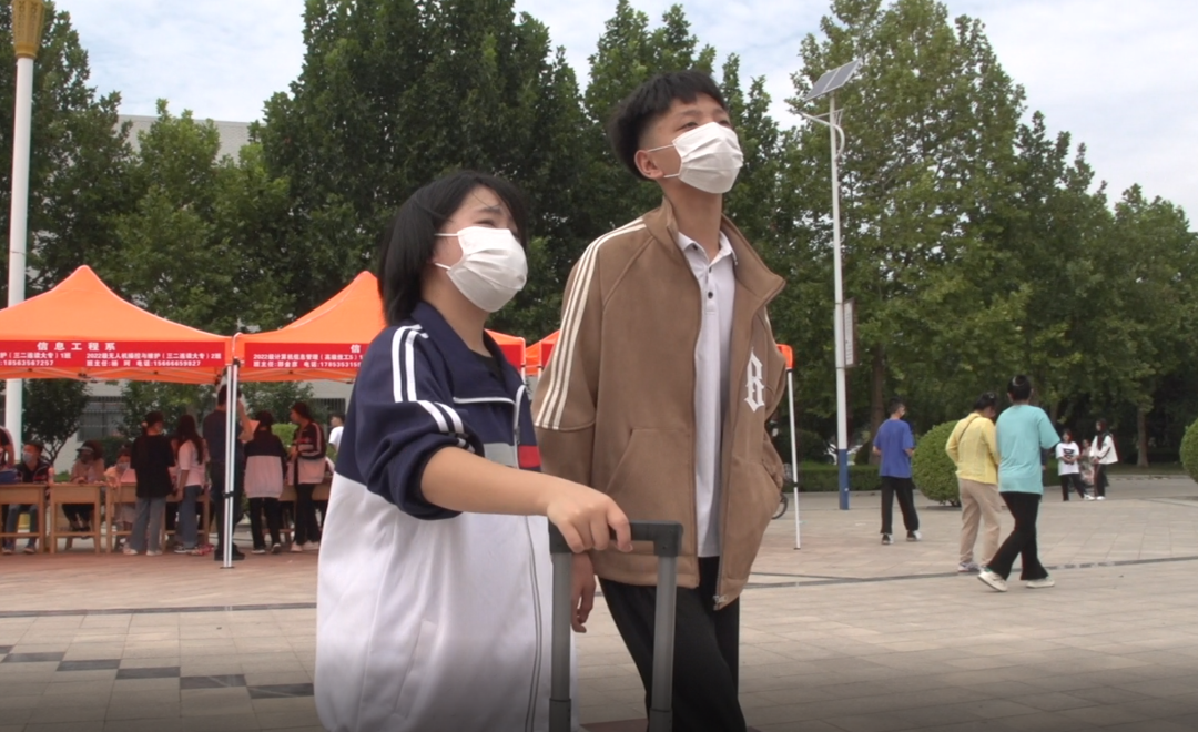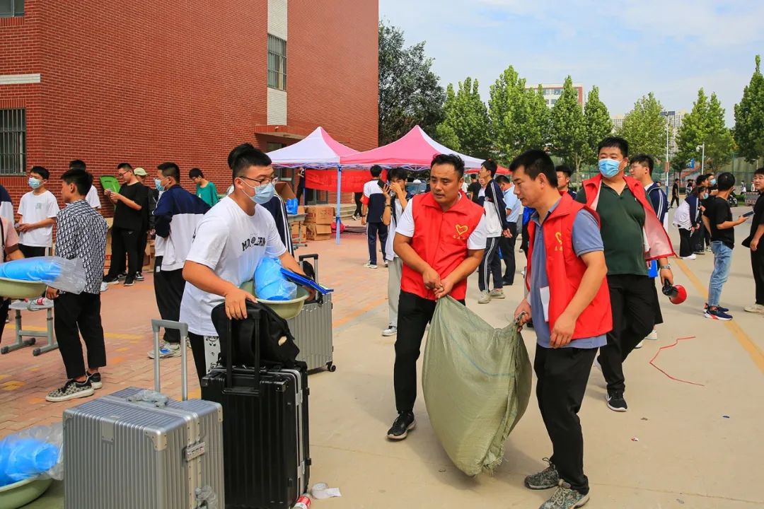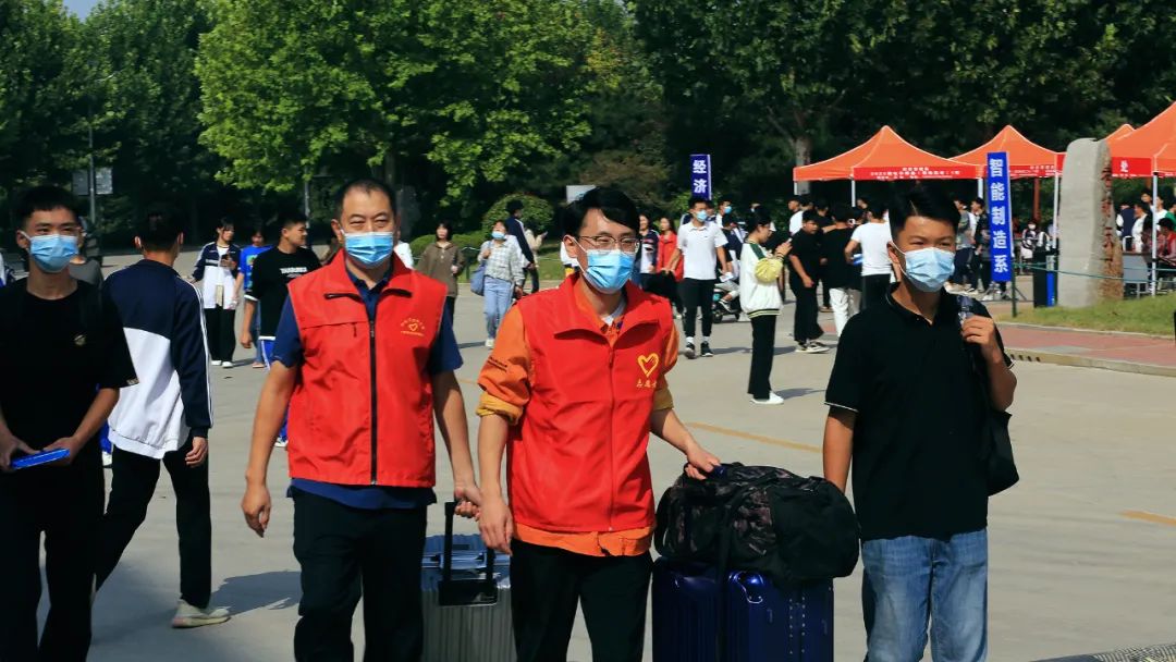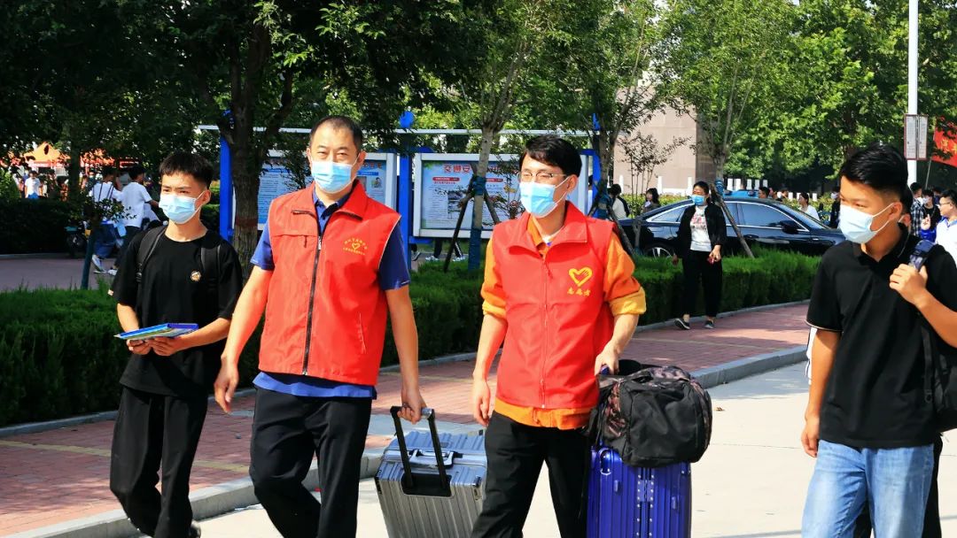 全国职业院校技能大赛“焊接技术”赛项一等奖获得者褚天亮,指导教师金胜举也加入到孔繁森志愿服务队的行列中,为新生作“现场指导”,帮助新生搬运大件行李。