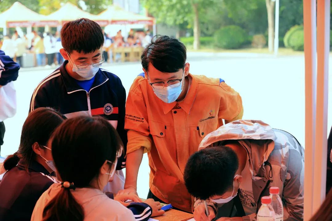 山东省技术技能大师冯焕芹,也来到现场“传帮带”,山东省技术能手柴守立,向入学新生伸出热情的“手”。