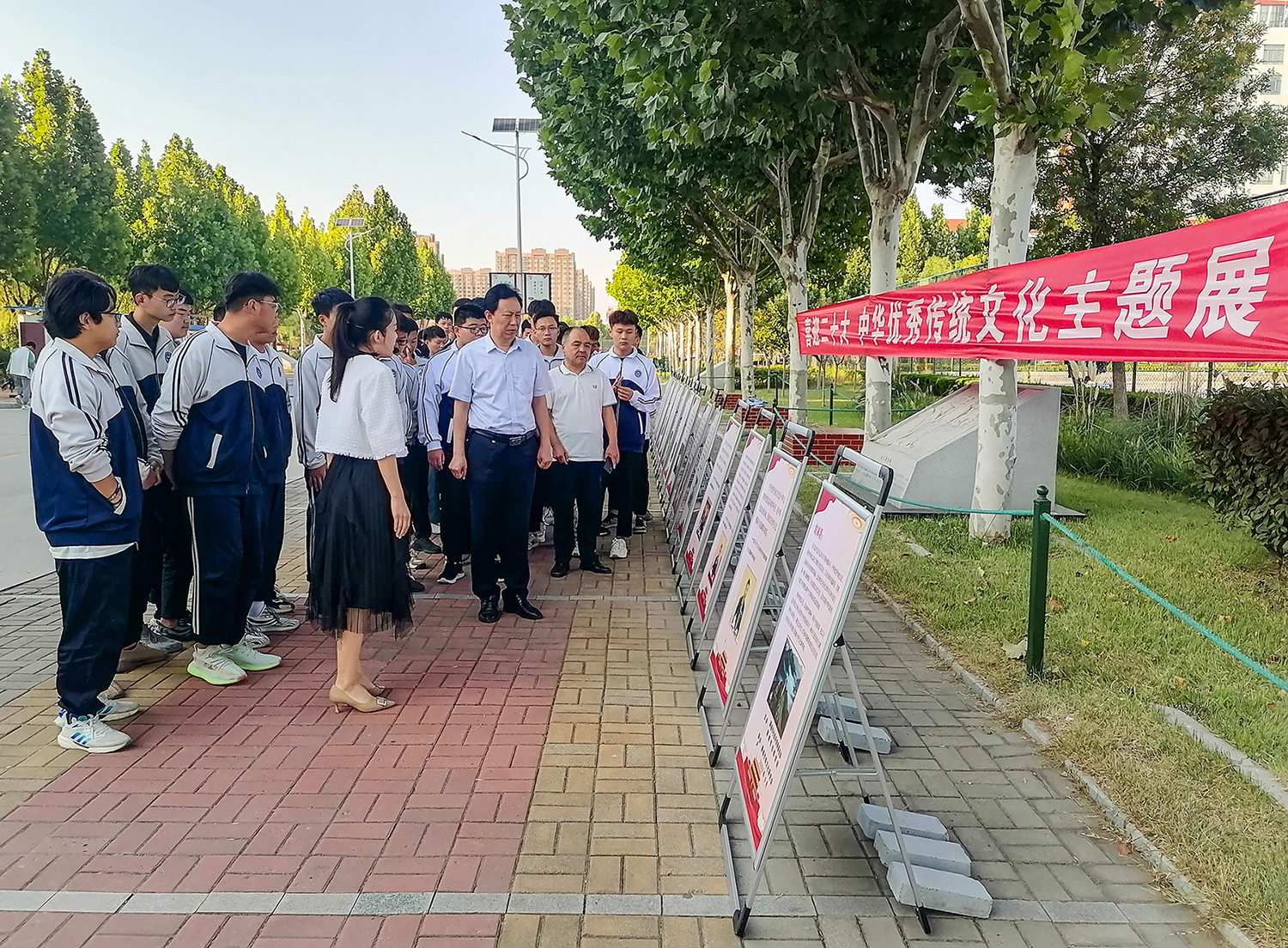 为迎接党的二十大胜利召开,传承弘扬中华优秀传统文化,培养全院师生的爱国主义情怀,9月25日,一场由聊城市技师学院、聊城市社科联主办,聊城传统文化研究会承办的“赓续中华文脉 坚定文化自信——习近平总书记论中华优秀传统文化主题展”在学院运动场西侧的孔子大道开展。学院党委副书记、院长刘德云到现场参观。