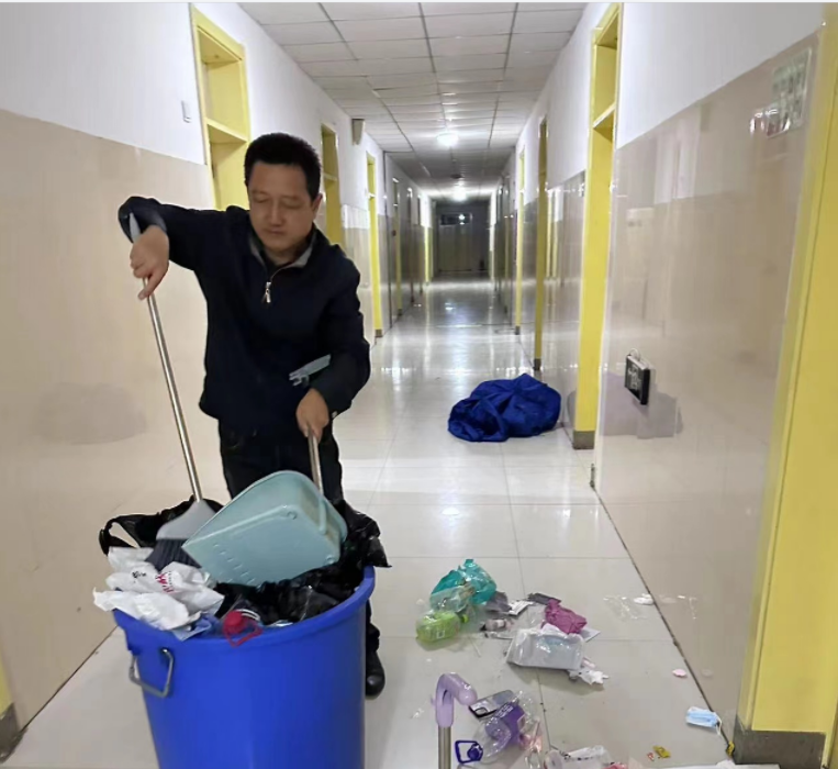 当杨秀芳老师把所有宿舍清扫完毕,拖着疲惫不堪的身体到家,已是晚上八点。凌晨一点,她刚睡下没多久,就接到电话,要求班主任重新整改学生宿舍,再次提升宿舍卫生标准。她把熟睡的丈夫从睡梦中叫醒,带上了家里的洁厕净、皮手套、抹布、洗洁精,一路开车到宿舍。杨秀芳和丈夫两个人逐间宿舍进行检查和清理,不放过任何一个死角。特别是便池,他们用刷子一点点地清理,最后擦得干干净净。“我做的这一切工作的目的,就是不想给学校抹黑,让来这里的隔离者感到温暖。当我结束工作时已经是凌晨四点了,其实还有更多的班主任还在工作着,我相信大家和我一样都有一个共同的想法,就是在疫情面前多给别人一些温暖,展现我们孔繁森母校的风采。”杨秀芳说。