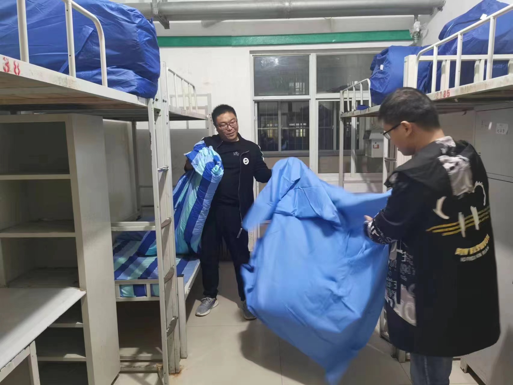 “赵老师,你休息会儿,剩下的宿舍我帮你清扫!”建筑工程系的薛泽东老师布置好自己的宿舍后,又主动要求帮助其他老师。赵飞担任三个班级的班主任,13间宿舍的清扫工作对于一个女老师来说,的确是体力告急。“没事,我还能坚持,咱们系有几位老师年龄大了,腰不好,你先帮她们去干吧!”赵飞说道。