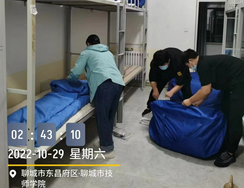 学生工作处副处长姚玉财带领学生科的杨志、孙丽两位科长亲自上阵,协助清理学生宿舍、运送物品、布置宿舍,为隔离人员的入住做好准备。这些工作结束后,他们又和高新区防疫小组一起验收,组织各系负责人,连夜召开紧急会议,详细说明整改问题。接着又马不停蹄,和值班人员一起布置警戒线,安放防护栏,划分隔离区域,做到区隔清晰,区域分明,确保隔离点井然有序……当一切布置停当,已经是第二天早晨7点多了。