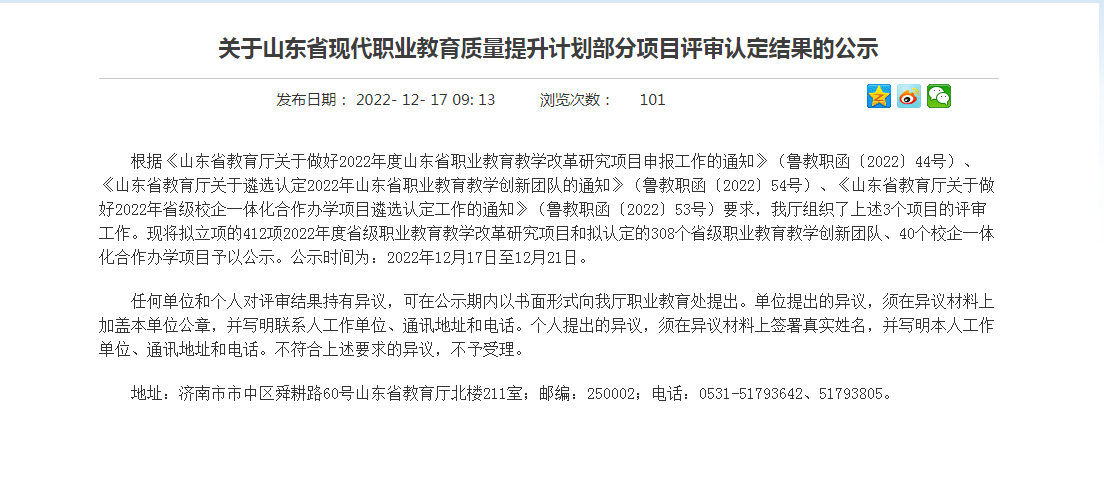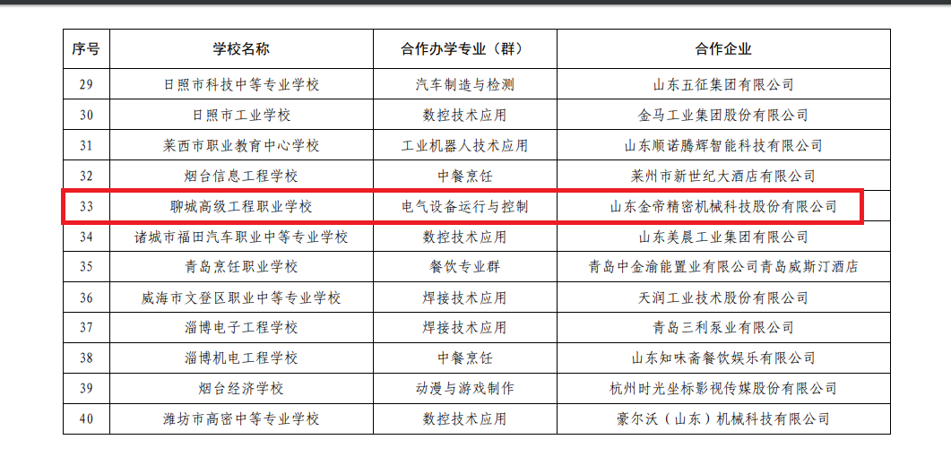 12月17日,省教育厅公示山东省现代职业教育质量提升计划部分项目评审认定结果,我院电气设备运行与控制专业校企一体化合作办学项目,成功入选2022年山东省校企一体化合作办学项目名单。