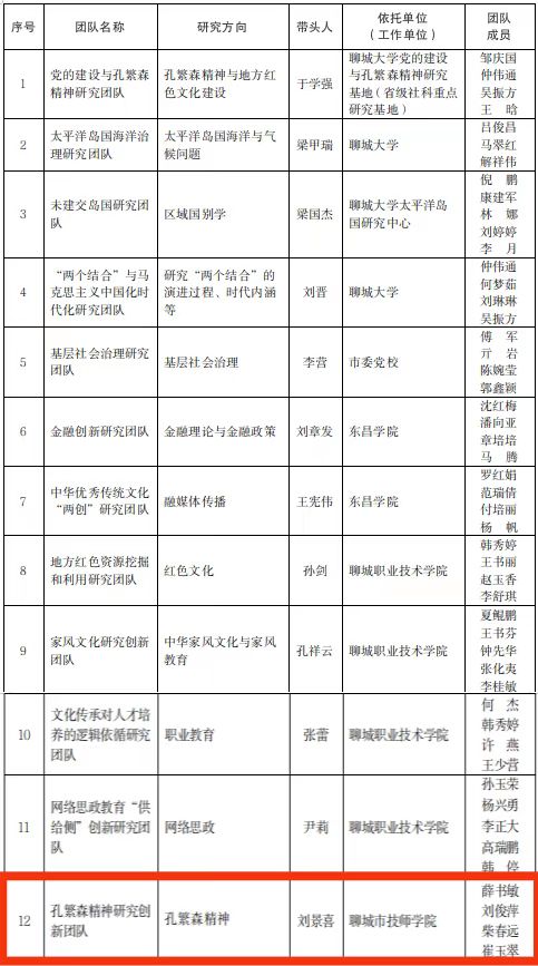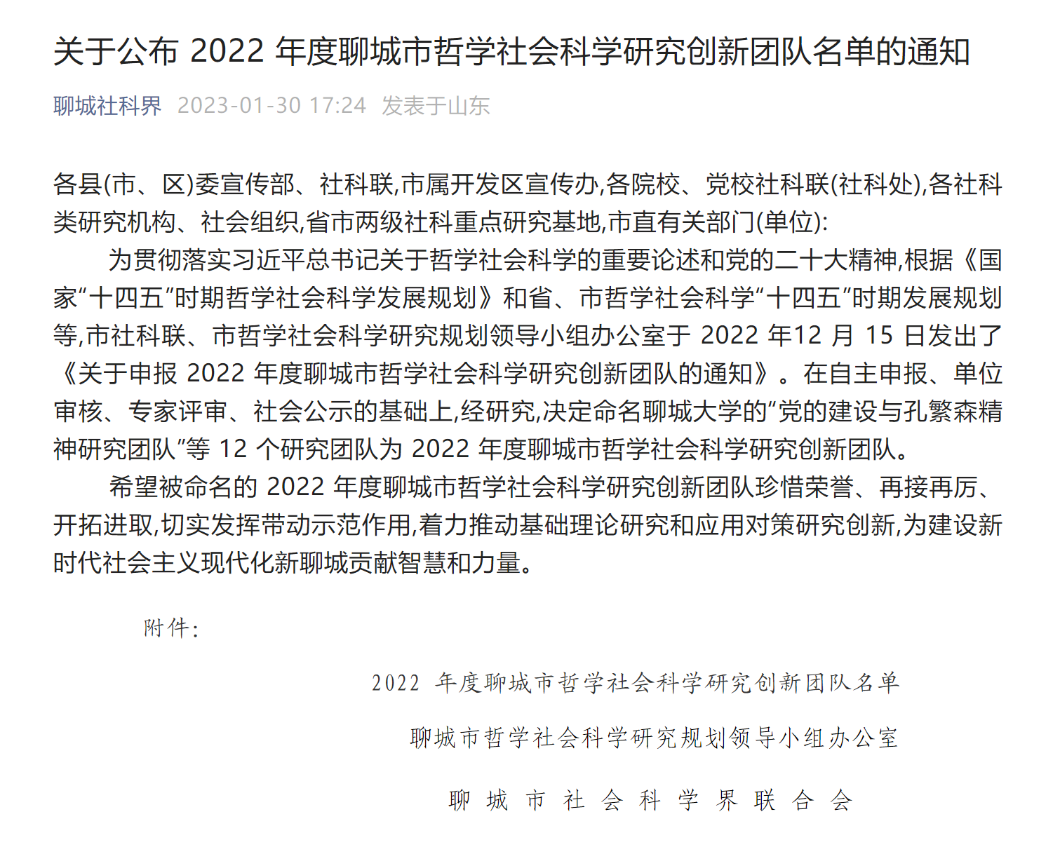 1月30日,聊城市哲学社会科学研究规划领导小组办公室、聊城市社会科学界联合会发布《关于公布2022年度聊城市哲学社会科学研究创新团队名单的通知》。聊城市技师学院孔繁森精神研究创新团队名列其中,成功获批。