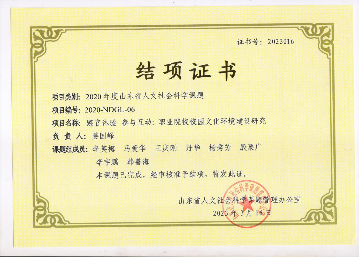 此次结题的课题研究均具有鲜明的问题导向,角度新颖,落地有实效,有效推进学院人文社科方面的研究上台阶、上水平,对山东省职业教育发展起到良好的助推作用。下一步,学院将进一步扎实有效地开展科学研究工作,提升学院科研水平,助推学院高质量发展。