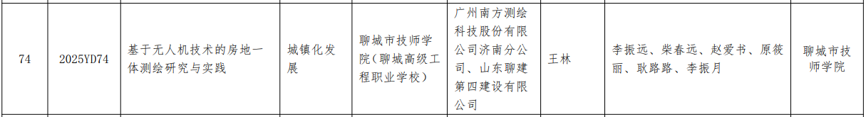 该项目隶属于“城镇化发展”技术领域,由学院王林老师团队牵头,联合广州南方测绘科技股份有限公司济南分公司、山东聊建第四建设有限公司共同实施。项目组将围绕无人机航测技术在房地一体测绘中的应用展开研究,通过开发高精度数据采集与处理系统,解决传统测绘效率低、成本高、地形适应性差等问题,为聊城市新型城镇化建设提供技术支撑。