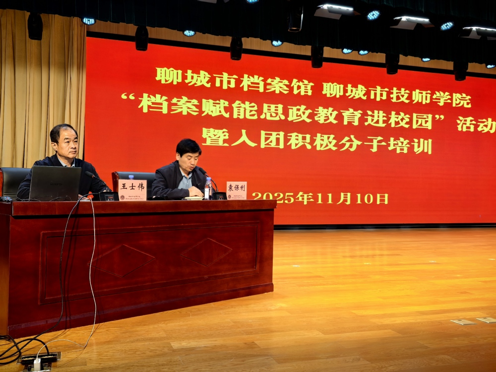 11月10日,聊城市档案馆与学院联合举办的“档案赋能思政教育进校园暨入团积极分子培训”活动在学术报告厅成功举行。市档案馆副馆长王士伟应邀作专题报告,通过挖掘地方档案的红色资源,以史实育人、以文化人,为现场100多名入团积极分子带来了一堂深刻而生动的思想政治课。