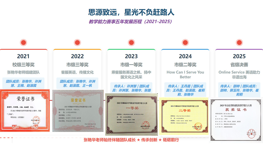 翻阅教学能力大赛的五年相册,犹如观看一场英语教学的接力赛。从2021年张艳华老师组队在校级赛事中脱颖而出,2022年带队初试锋芒获市级三等奖,到2023年新团队渐入佳境卫冕市级一等奖,再到2025年惊喜乍现,勇夺省级二等奖——这不仅是奖项的升级,更是一场关于教育理想的薪火相传。