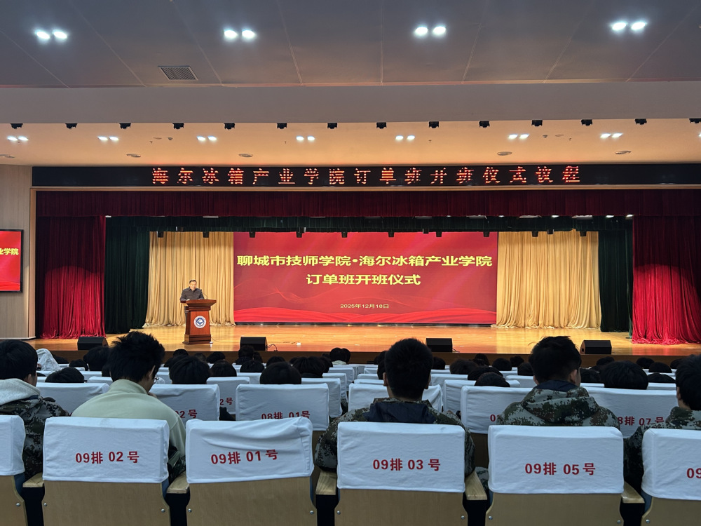 12月18日下午,学院在实训楼二楼学术报告厅举行海尔冰箱产业学院订单班开班仪式。学院党委委员、副院长徐洪祥,海尔智家黄岛园区校企合作经理王玺出席仪式。仪式由学院校企合作与招生就业服务中心主任高红主持。