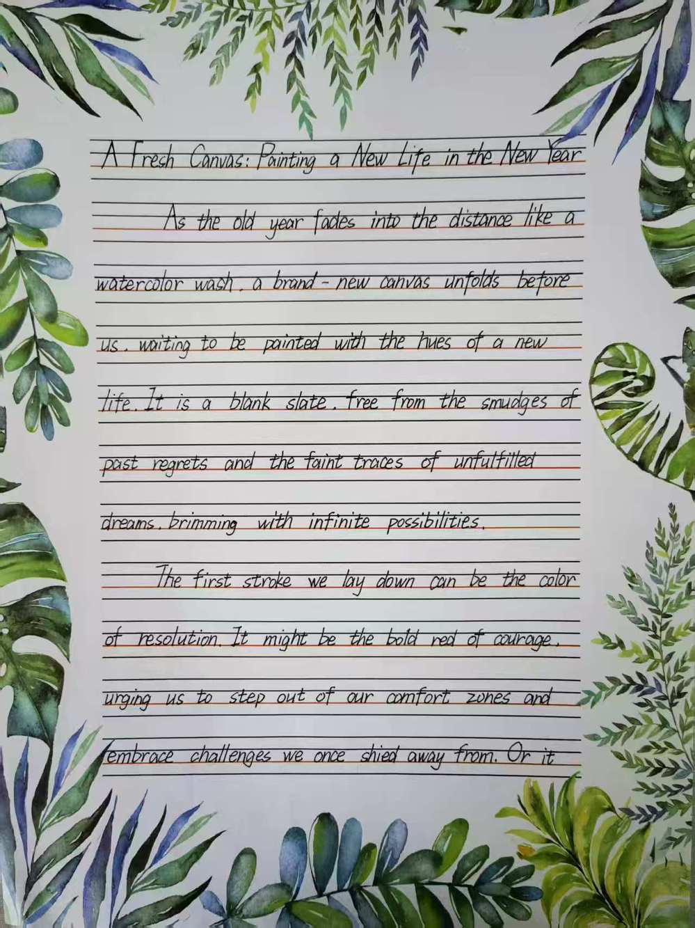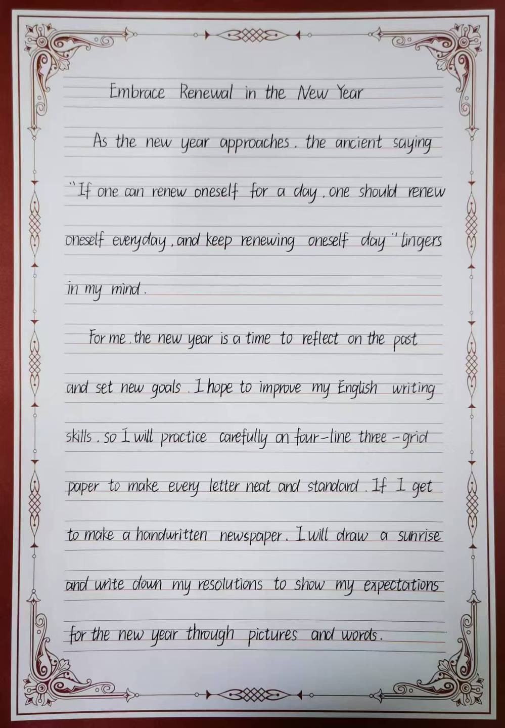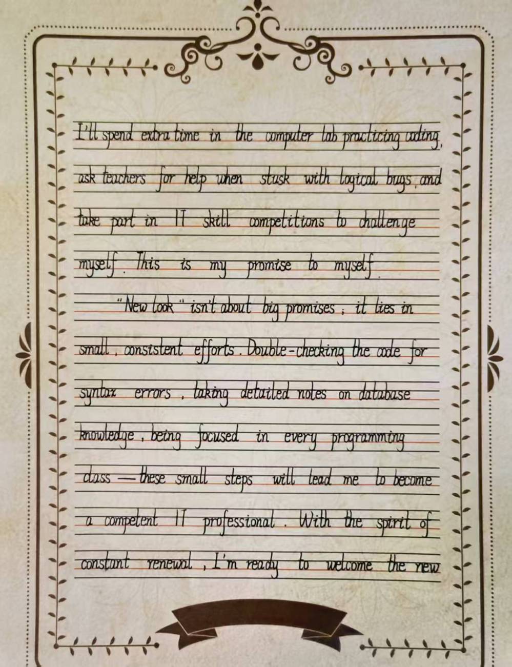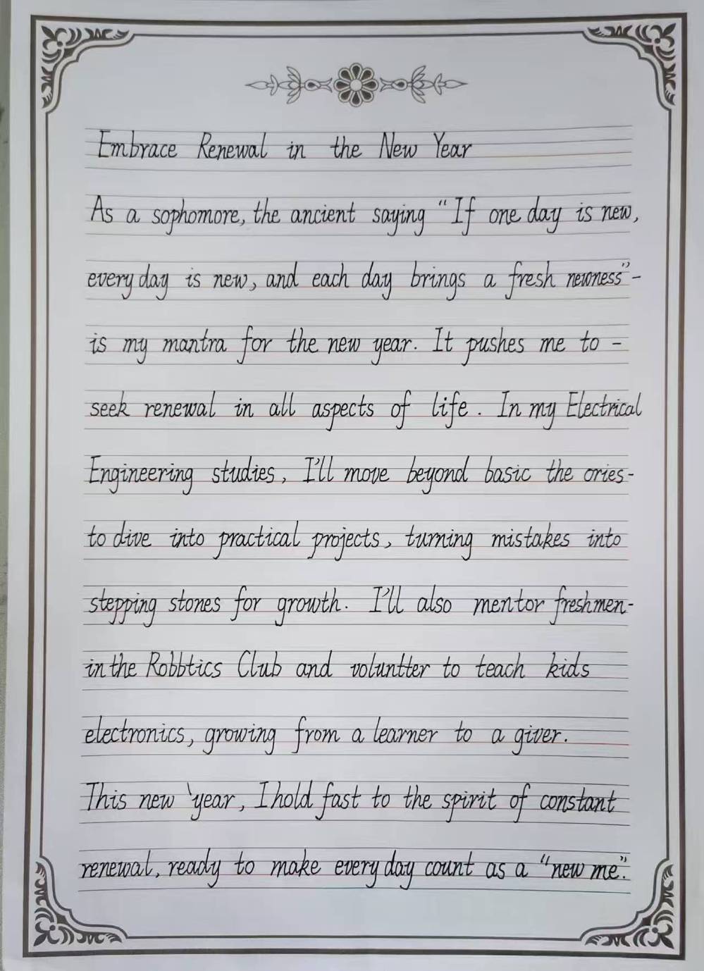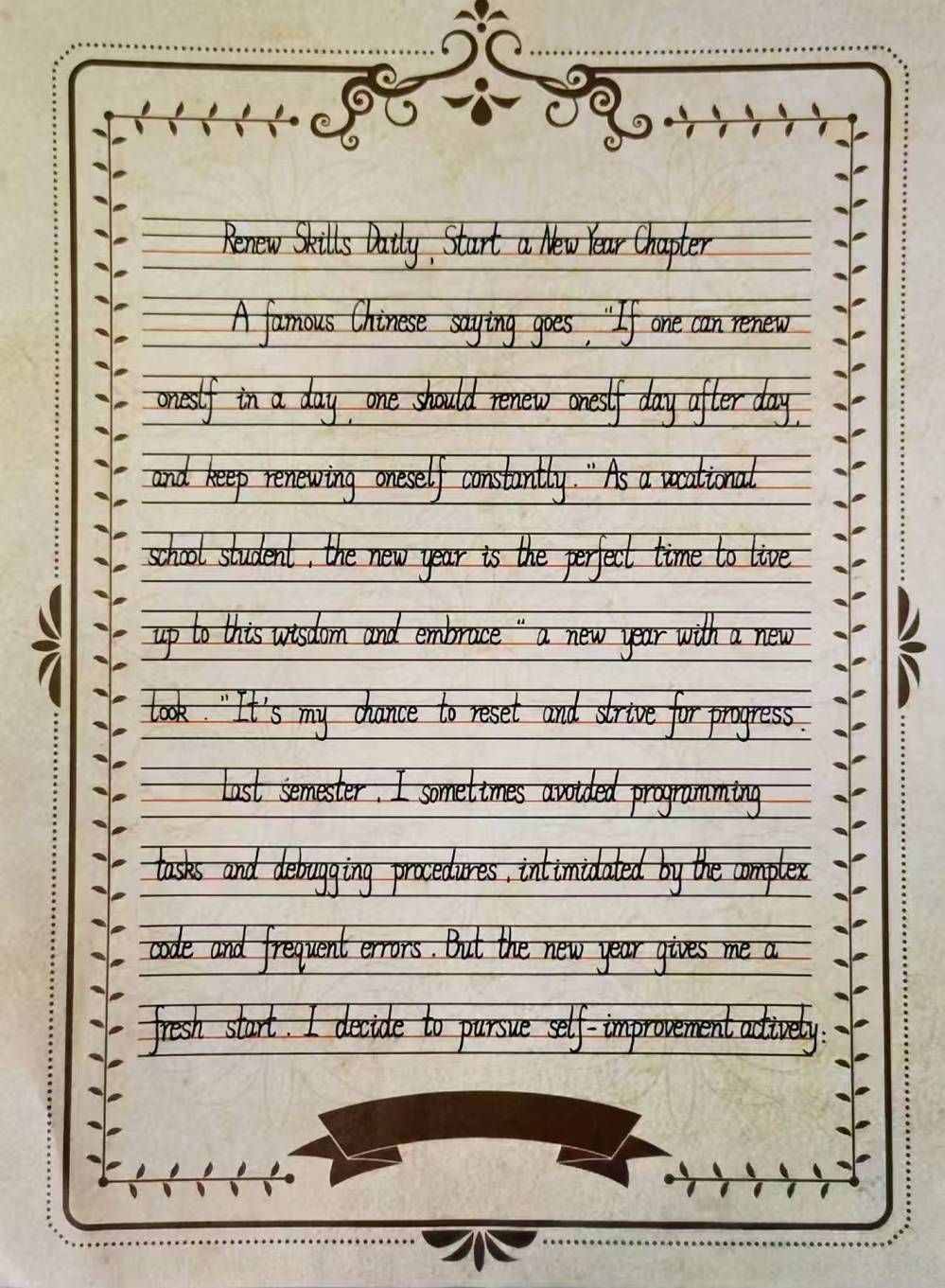 为激发学生的英语学习兴趣,提升英语书写技能,涵养综合审美素养,近日,学院举办“苟日新,日日新,又日新——新年新气象”英语素养大赛。本次活动面向全校24级学生,旨在鼓励学子们通过英语艺术创作,感悟与时俱进、自强不息的精神内核,展现积极向上的崭新风貌。