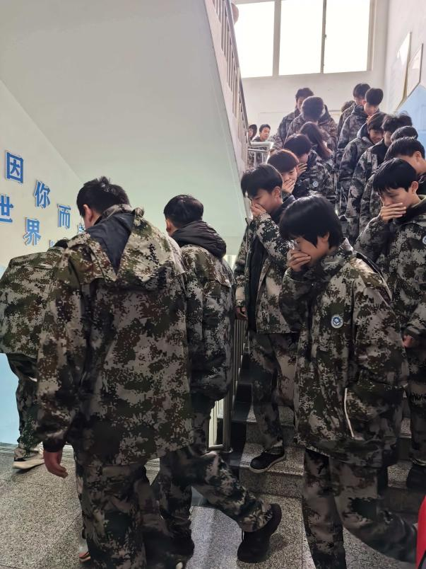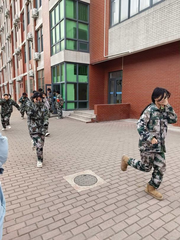 9时45分,在宿舍区,学生在教官、层长及学生干部的指引下,学生迅速起床,用湿毛巾捂住口鼻,按照宿舍区疏散预案,沿着不同的安全出口和疏散楼梯,冷静、快速地撤离至宿舍区外的空旷安全地带。教官和宿舍管理人员全程参与,清点人数,维持秩序,并模拟进行了初步情况排查。