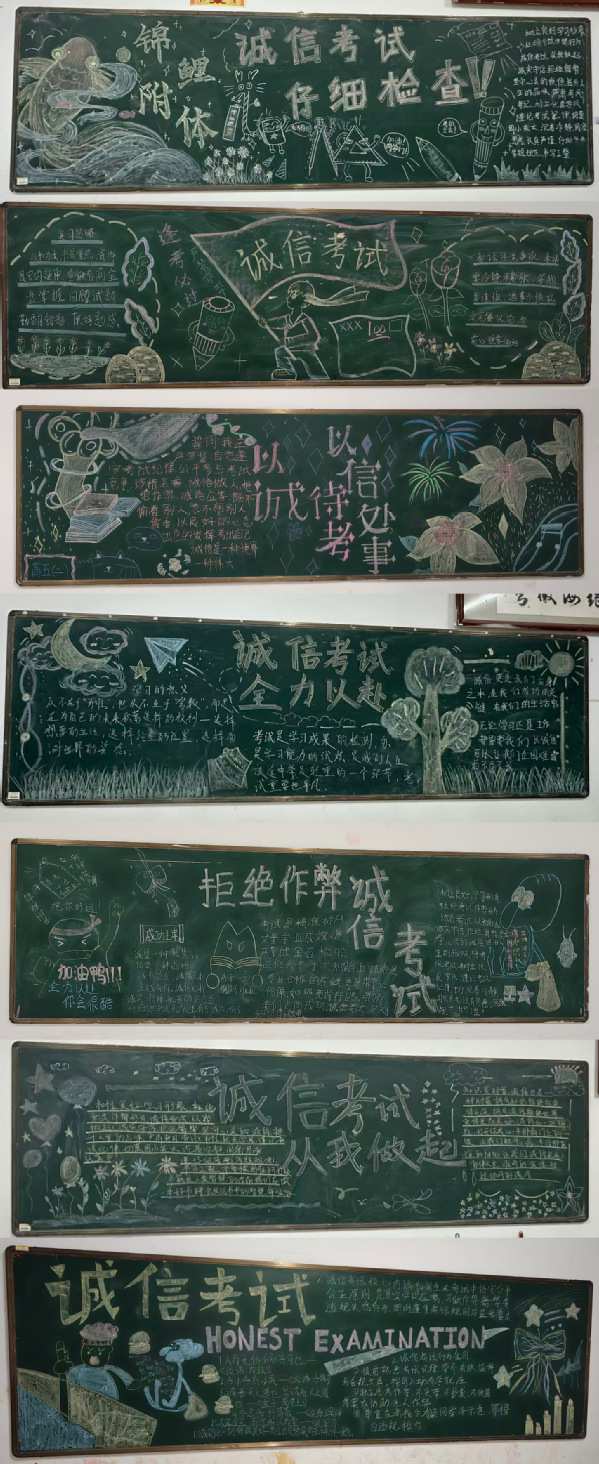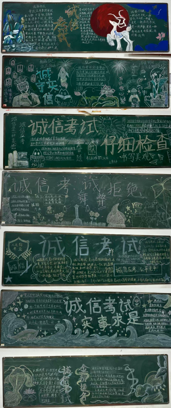 与主题班会同步开展的黑板报征集活动,成为弘扬诚信美德的“无声课堂”,赢得全系学生积极响应。各班级精心构思,将诚信理念融入版面设计,图文并茂、立意鲜明。既清晰呈现考场纪律、违纪处理等关键信息,又以名言警句、生动漫画、诚信倡议书等形式,弘扬诚实守信美德,批判考试舞弊行为,在潜移默化中强化了学生的规则意识与自律精神。