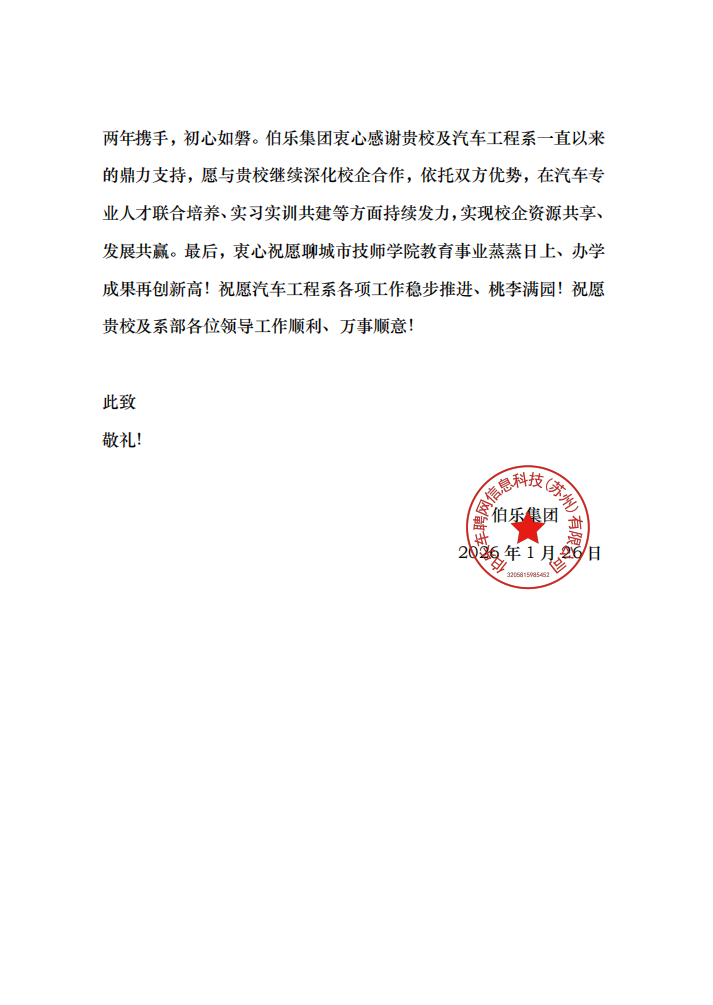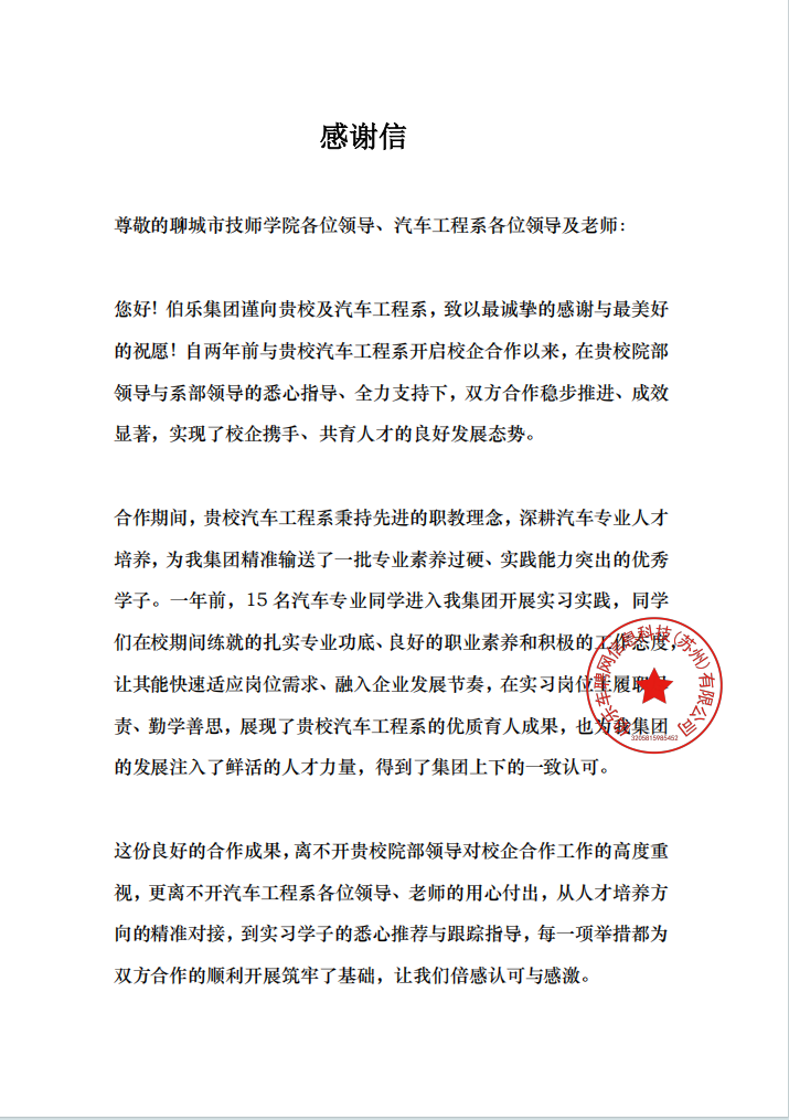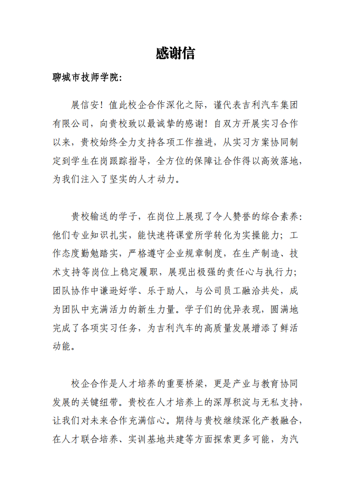 在本学期学生实习工作即将圆满收官之际,汽车工程系合作单位吉利汽车集团有限公司、伯乐车聘网有限公司、蜂巢动力系统(江苏)有限公司等三家企业纷纷发来感谢信,饱含对我院育人工作的肯定与赞许,为校企协同育人实践写下生动注脚。