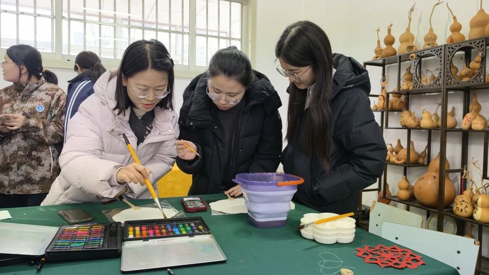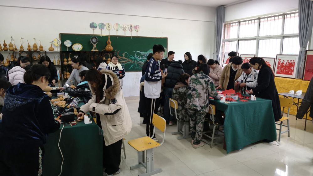 活动现场暖意融融、氛围浓厚,非遗社团指导教师全程现场授课、耐心指导。活动设置葫芦烙画、剪纸、漆扇等多项体验环节。其中,葫芦烙画以“铁为笔、火为墨”,承载着“福禄”的美好寓意,指导教师耐心讲解烙画的火候控制与线条勾勒技巧;剪纸环节中,大家手持剪刀,在红纸之上剪出吉祥纹样,感受这项古老技艺的精巧灵动;漆扇制作现场,大家调漆、上色、点缀,亲手打造专属自己的非遗手作,沉浸式体验传统漆艺的雅致韵味。