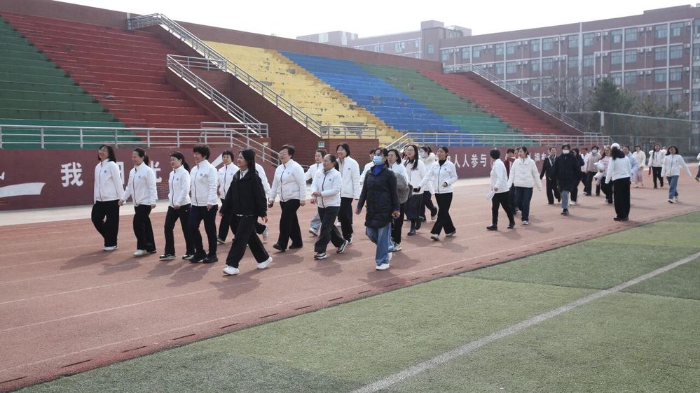 表扬结束后,随着一声号令,春日健步走活动正式拉开帷幕。在学院领导的带领下,女教职工们沿着体育场阔步前行。春日的暖阳洒落肩头,大家精神抖擞、步伐矫健,一路欢声笑语,畅享运动带来的活力与快乐。飘扬的旗帜、灿烂的笑脸、跃动的身影,构成春日校园里一道亮丽的风景线。