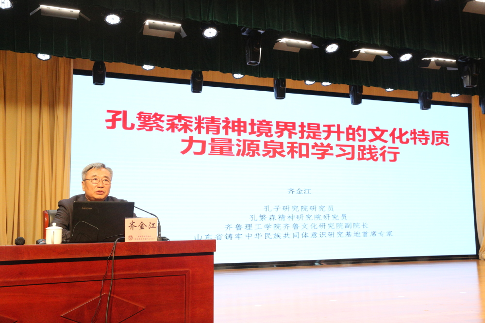 4月20日,学院举办“工匠大讲堂”双百计划专家报告会2026年第一讲,邀请孔子研究院研究员、孔繁森精神研究院研究员、山东省铸牢中华民族共同体意识研究基地首席专家齐金江围绕“孔繁森精神境界提升的文化特质、力量源泉和学习践行”作专题报告。学院党委书记金同元及领导班子成员聆听报告,学院党委委员、组织人事处处长孔晓燕主持活动。