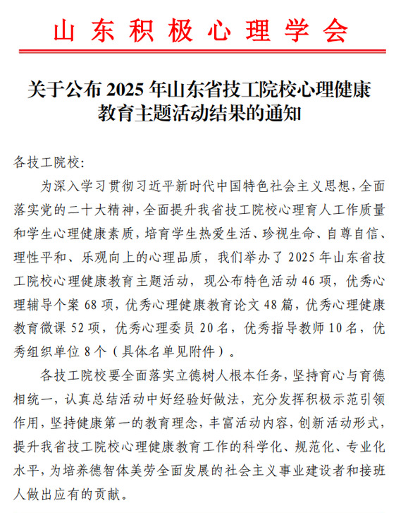 近日,山东积极心理学会公布2025年山东省技工院校心理健康教育主题活动评选结果。学院在此次评比中表现突出,荣获多项荣誉,充分彰显了学院在心理健康教育工作方面的扎实工作成效。