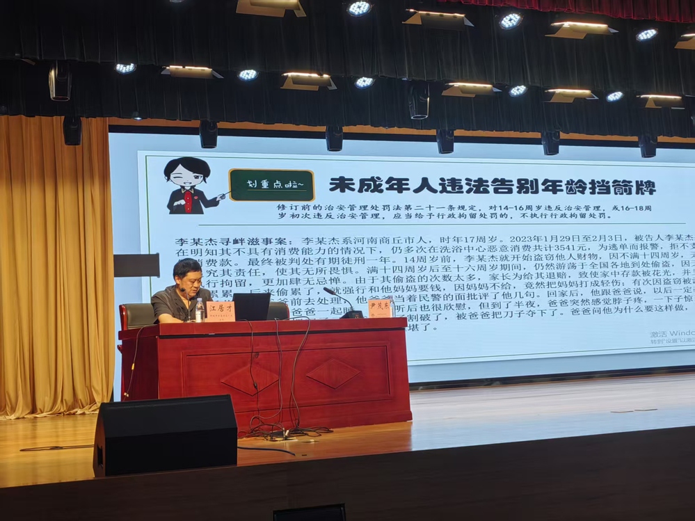 讲座中,江庭长立足当前社会治安形势,从违法犯罪的整体态势、常见类型与成因、带来的多重危害以及有效的预防措施等多个维度,进行了全面而深入的阐述。他结合自身多年审判工作中承办的大量聊城本地的真实、鲜活的典型案例,以案释法,以法论事,增强了讲座的吸引力和说服力。江庭长特别警示同学们,“年龄绝不是违法犯罪的护身符”,法律底线不可触碰。他通过剖析发生本地青少年的案例,深入浅出地讲解了刑事责任年龄、儿童与幼女的法律界定、共同犯罪、实行过限、隔空猥亵等重要法律概念和知识,明确了行为的法律边界,引导同学们知悉“哪些可为,哪些不可为”,从而在日常行为中有所遵循,恪守法律底线。