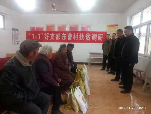 我系党支部全体成员自费购买了油、米、面,在系主任白碧石、副主任李全富带领下,送到东曹村四户困难户的手中与村民拉家常,了解目前的生活状况,争取更多帮扶.村民们很高兴,对此表示感谢!