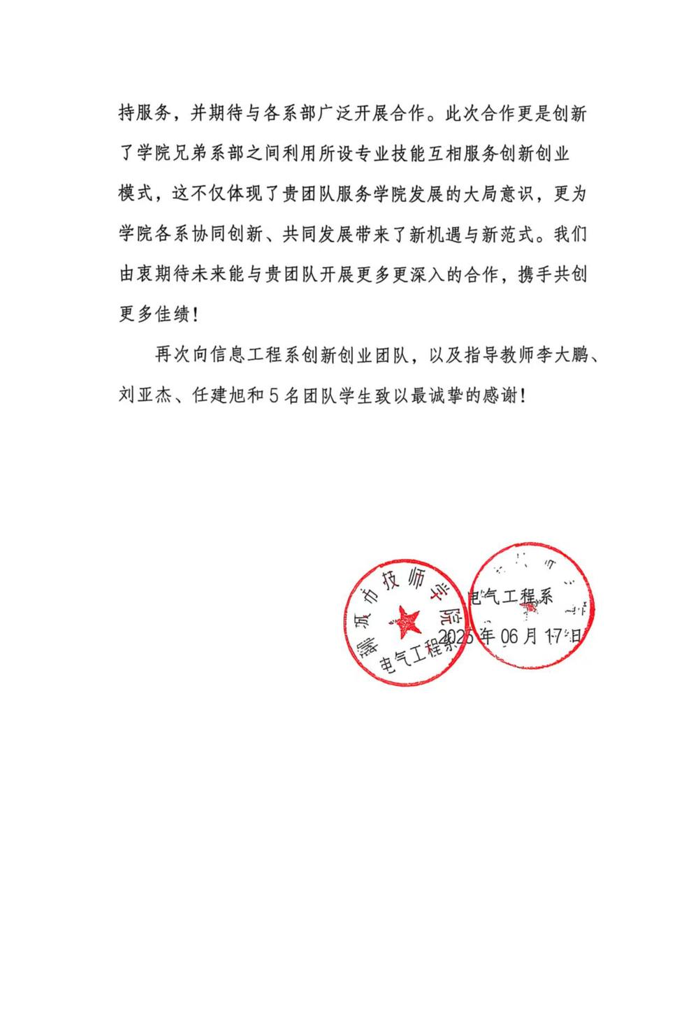 为此,电气工程系对信息工程系的鼎力相助表示衷心感谢,并附感谢信赞扬团队的专业能力和奉献精神。