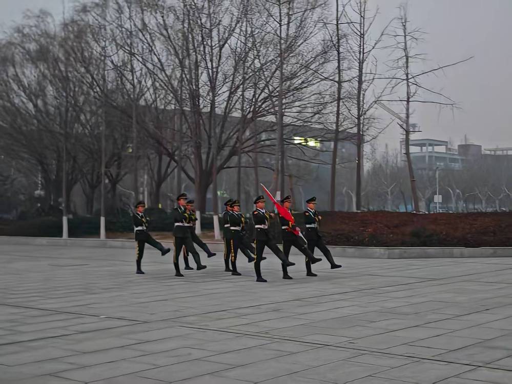 伴随着激昂的出旗曲,国旗护卫队迈着整齐有力的步伐护送国旗走向旗台。雄壮的《义勇军进行曲》奏响,鲜艳的五星红旗冉冉升起、迎风飘扬,全体师生肃立注目,齐唱国歌,深切表达对祖国的崇敬与热爱。