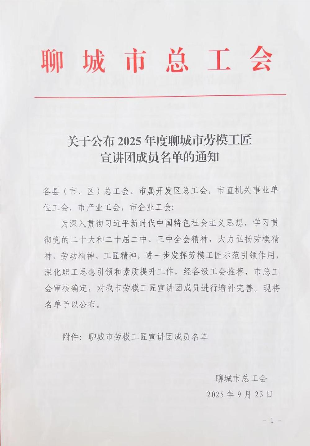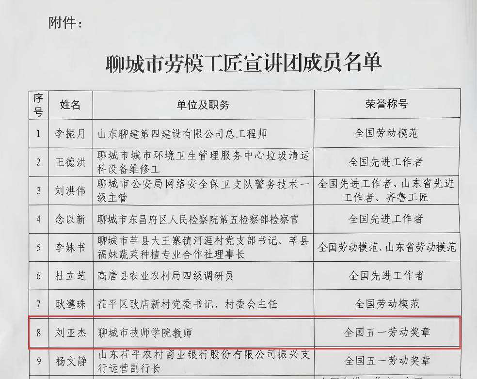 近日,2025年度聊城市劳模工匠宣讲团成员名单正式公布,我院教师刘亚杰凭借深厚的专业素养与对工匠精神的深刻践行成功入选,成为传递劳模精神、工匠精神的重要力量。