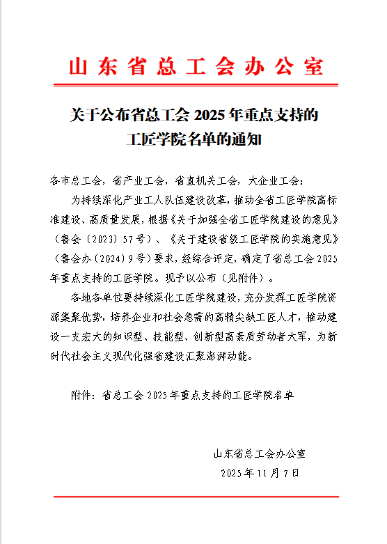 11月7日,山东省总工会公布2025年重点支持的工匠学院名单,我院“水城工匠学院”上榜。