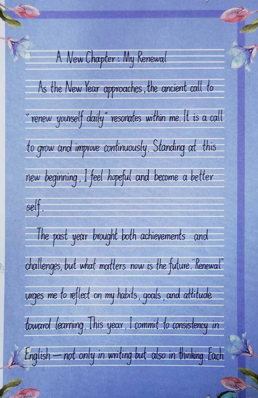 大赛以中华经典箴言“苟日新,日日新,又日新”为精神内核,拟定英文主题“New Day, New Me: Embrace Renewal in the New Year”。参赛学生围绕这一主题,或进行原创文段写作,或精心选编契合主题的英文内容,表达对自我革新的追求、对新一年的美好憧憬与坚定信心。