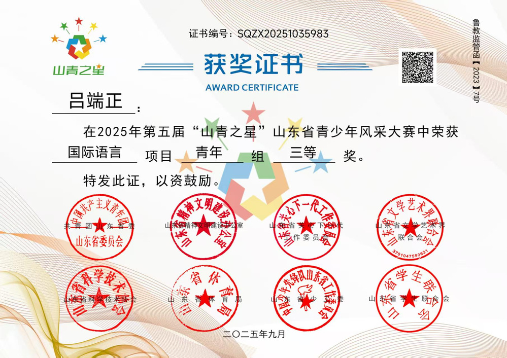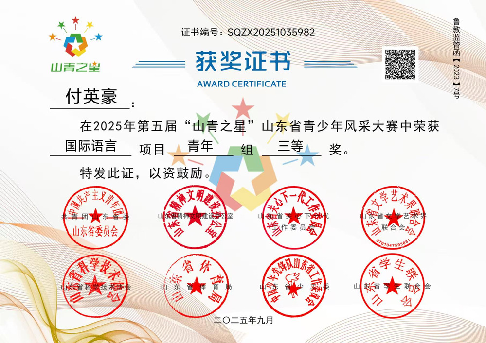近日,2025年第五届“山青之星”山东省青少年风采大赛评选结果正式揭晓。在本届大赛中,我院推荐参赛作品成绩斐然,共有16项作品获奖,整体获奖率位居全省前列。其中,英语教研室精心推选的作品《英语趣配音》凭借其新颖的构思、扎实的语言功底与生动的艺术表现,荣获大赛三等奖,展现了我院学子在外语应用与跨文化表达方面的出色能力。