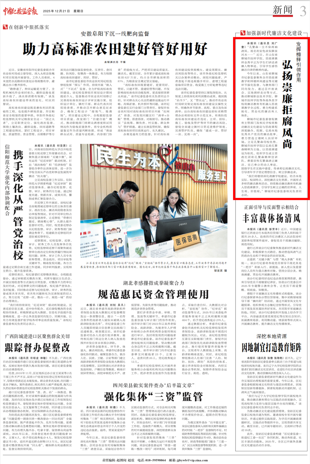 12月21日,《中国纪检监察报》在《发挥榜样引领作用弘扬崇廉拒腐风尚》报道中,聚焦我院以孔繁森精神为纽带、深化清廉学校建设的实践探索。作为孔繁森同志的母校,学院立足这一独特文化优势,打造了以孔繁森精神为主线、廉洁教育为内核的思政育人创新项目,通过将廉洁文化与思政教育、校园活动深度融合,构建起系统化、常态化的育人体系。
