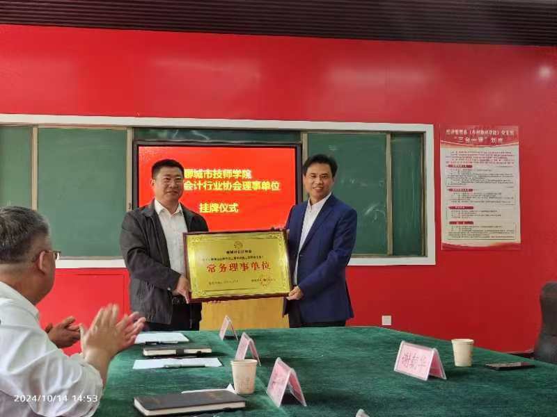 2024年10月14日下午,经济管理系与聊城市会计行业协会举行会计行业协会理事单位挂牌仪式会议室举行。聊城市会计行业协会会长谢朝华会长,经济管理系主任吕同华分别介绍了各自单位的情况,并就经济管理系与会计行业协会携手建设与发展提出了希望。