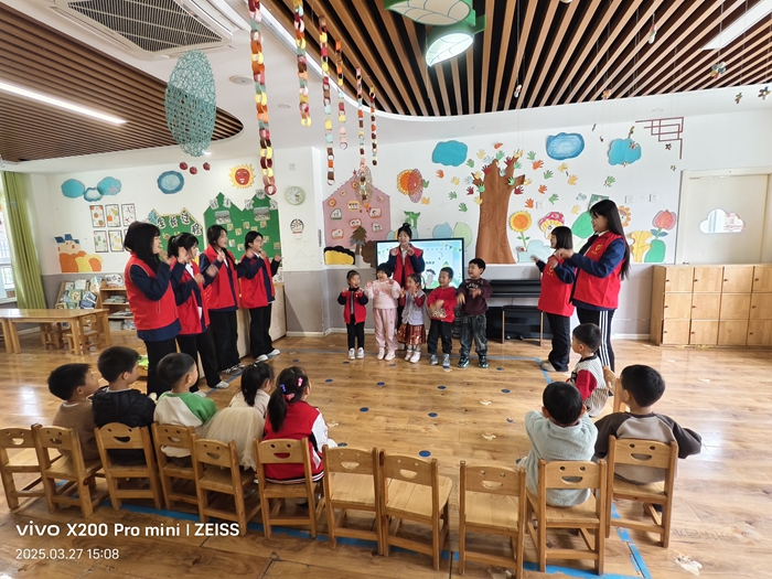 3月27日,在雷锋月期间,经济管理系志愿服务队的9名师生志愿者走进海德公园幼儿园,以春日爱满溢,熹微雷锋行为主题开展沉浸式教育活动。志愿者们精心设计了三步曲教学法:首先通过图片,用色彩斑斓的画面展现雷锋事迹;接着创设“公交车让座”情景模拟,孩子们在角色扮演中体验互助温暖;随后教唱《好宝宝》时,孩子们用稚嫩的童声与志愿者们共同完成了一场别开生面的表演。