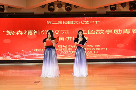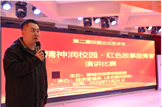 为深入弘扬孔繁森精神,挖掘红色文化时代价值,引导学生厚植家国情怀,聊城市技师学院团委联合经济管理系(乡村振兴学院)成功举办第二届校园文化艺术节——“繁森精神润校园・红色故事励青春”演讲比赛。比赛于11月24日下午3点在学院勤业楼五楼报告厅举行,各系部推荐的优秀选手同台竞技,展现新时代青年的精神风貌。学院团委莫家骐书记亲临现场并发表致辞,寄语全体参赛选手以演讲为载体,讲好红色故事、传递榜样力量,为现场比赛拉开了庄重而富感召力的序幕。