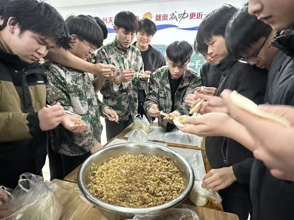 随后进行的包饺子环节温情满满。纪红梅副主任与李保奎老师走进学生中间,现场指导大家调馅、擀皮、包制,动作娴熟,耐心细致。师生一起,欢声笑语,热气腾腾的饺子不仅驱散了冬日寒意,更拉近了师生距离,营造出和谐向上的班级文化氛围。 此次活动劳逸结合,不仅增强了班级凝聚力,也让同学们在寒冬中感受到家一般的温暖。大家纷纷表示,将把这份关怀转化为学习的动力,以最佳状态迎接期末挑战。
