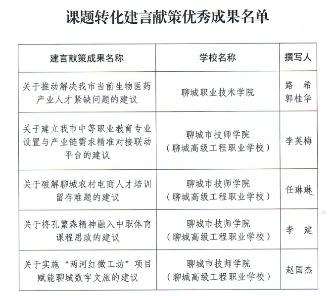 近日,我院申报的《精准分层:职业院校教师数字素养培训模式构建与实践研究》《数智化背景下中职院校“三阶四真四融”技能人才培养模式研究》等十项课题全部通过2025年聊城市职业教育研究课题鉴定,顺利获批结项。另有《关于建立我市中等职业教育专业设置与产业链需求精准对接联动平台的建议》等4项课题转化建言献策获得优秀成果,占全部获奖成果的80%。