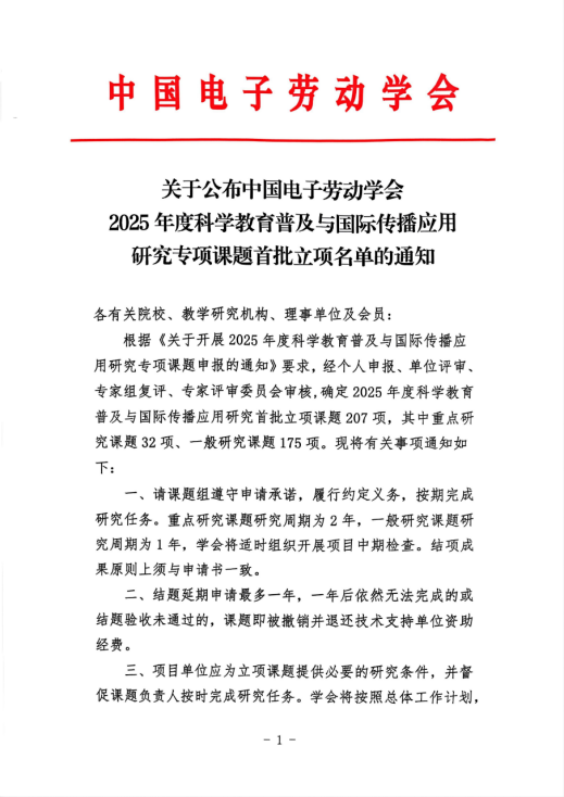 12月18日,中国电子劳动学会公布2025年度科学教育普及与国际传播应用研究专项课题立项名单,我院申报的《基于职业院校的科普与科研资源共享平台建设与运营机制研究》课题首批获得立项。