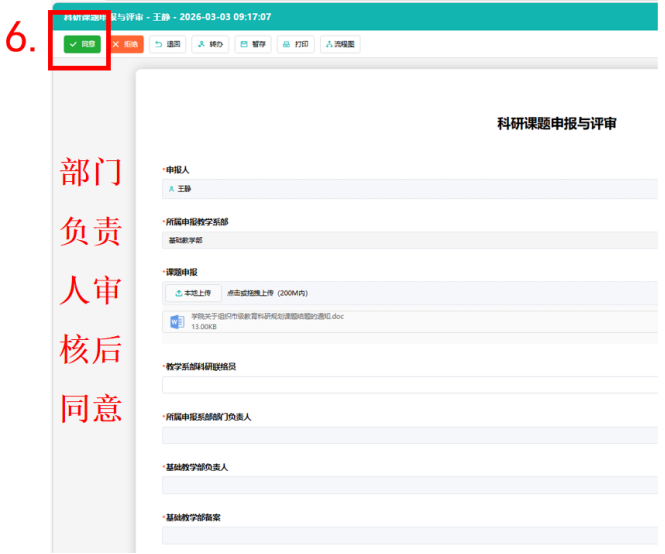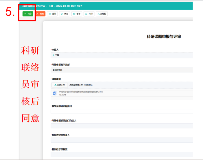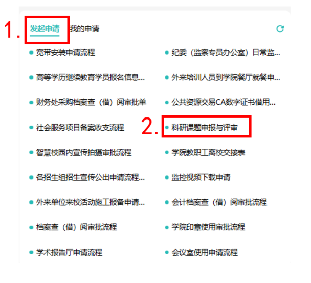 步骤如下:(1)登录智慧校园(2)发起申请(3)科研课题申报与评审(4)上传后提交(5)科研联络员审核后同意(6)部门负责人审核后同意
