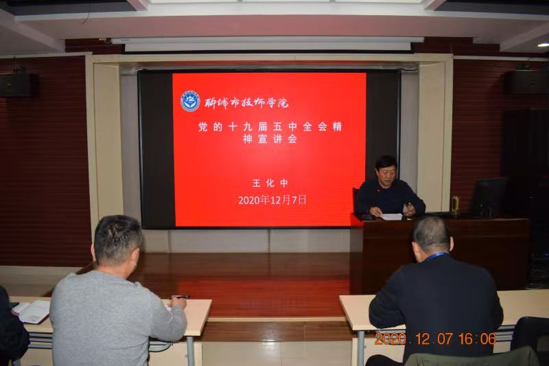 12月7日下午,学院党委委员、副院长王化中在培训中心三楼多功能教室为培训部、校企合作处、经济管理系党员干部及部分学生宣讲党的十九届五中全会精神。