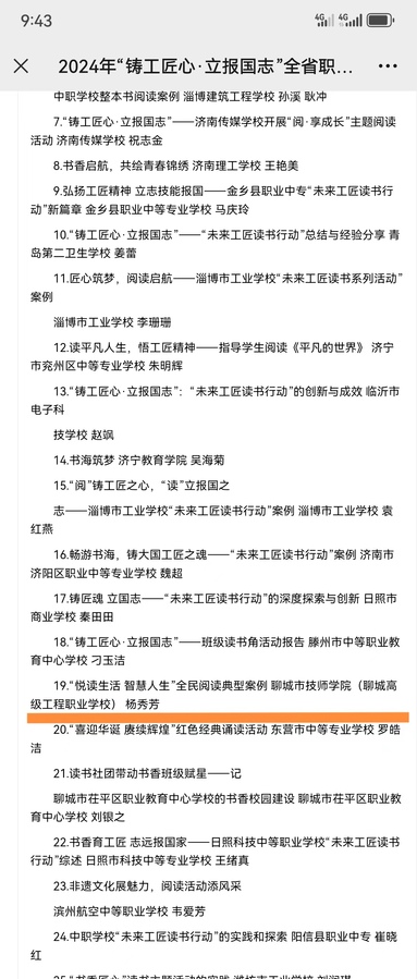 1月20日,《山东教育报》第七版专版公布了“2024年“铸工匠心·立报国志”全省职业院校“未来工匠读书行动”优秀案例、优秀征文名单”,聊城市技师学院:“悦读生活 智慧人生”全民阅读典型案例成功入选。