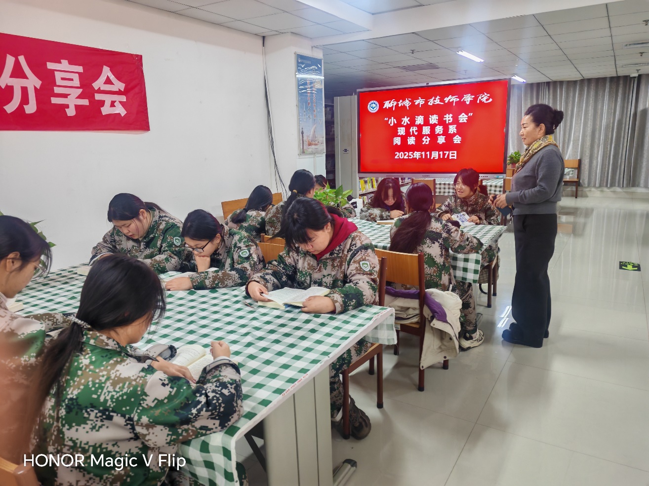 服务学生们图书借阅、学院微信工作群好书阅读推荐、为现代服务系开展“小水滴读书会”阅读课提供服务指导。