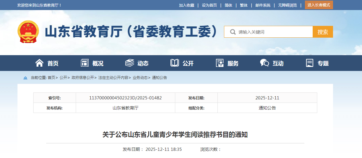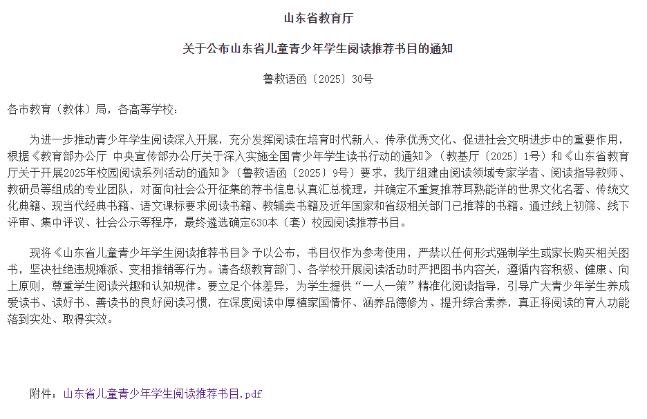 山东省教育厅:关于公布山东省儿童青少年学生阅读推荐书目的通知