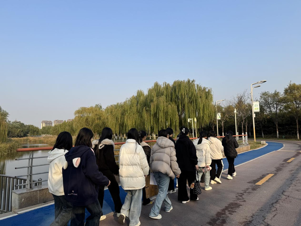 午后阳光温润和煦,同学们在教师的带领下沿绿道开启轻松徒步。大家步履轻快、谈笑风生,沉浸式欣赏沿途秋景,深吸清新空气,在自然的怀抱中舒缓身心、释放压力。徒步途中,同学们随手捡拾形态各异的落叶、松果与枝条,作为后续创作储备天然素材,在漫步中践行绿色环保理念,让文明素养与自然探索相伴相生。